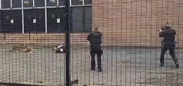 Video shared on social media appeared to show armed police officers pointing guns at a man on the ground as one screamed to onlookers: “Everybody else, get back. If you’re not involved, move back, get away… he has a bomb, go away.”